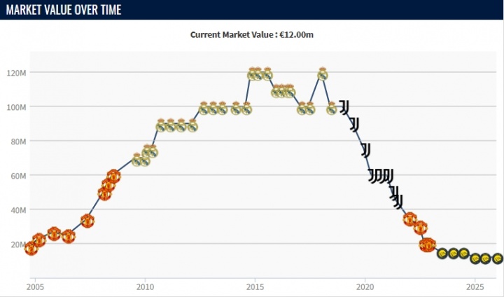 C罗职业生涯的巅峰身价为1.2亿欧,他在2014、2015以及2018年分别达到过这一数字。